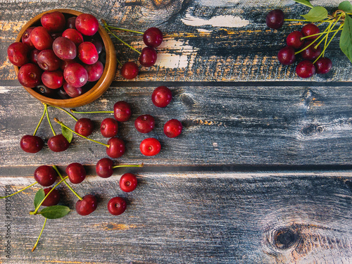 Ripe juicy red cherries lie in a wooden bowl and are scattered on the surface of the table.