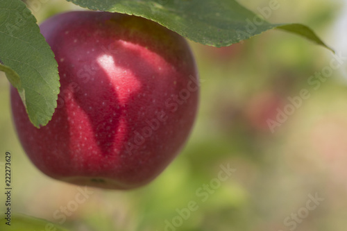 Ripe, liquid, natural, beautiful, juicy red Apple grows on the branches of the tree.