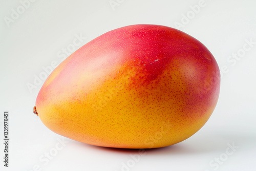 Ripe mango displaying vibrant red-yellow skin, positioned against clean white backdrop