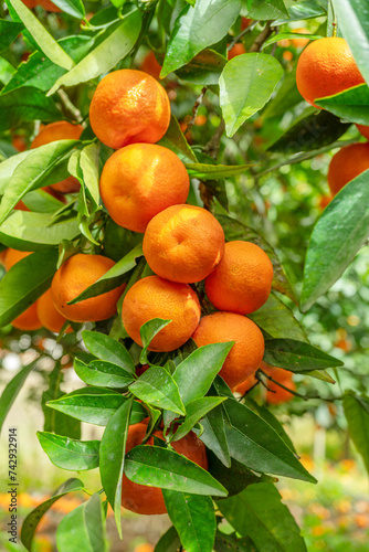 Ripe orange fruits on orange tree between lush foliage. View from below.