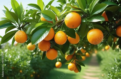 Ripe oranges hanging on a tree in the garden of an orange plantation.