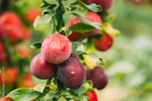 Ripe Prunus berries on Prunus trees In Summer Vegetable Garden.