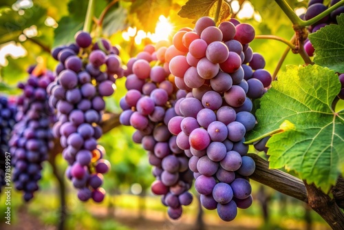 Ripe purple grapes cluster on a vine in a lush vineyard during harvest, plump and juicy, ready to be picked, surrounded by lush green foliage.