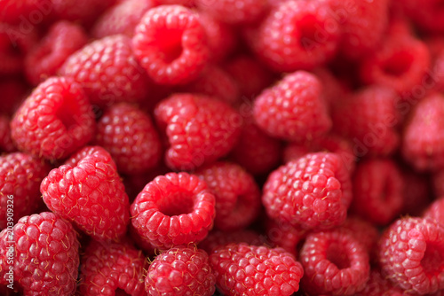 Ripe raspberries macro. Selective focus. Fruit background with copy space. Summer and berries harvest concept. Vegan, vegetarian, raw food.