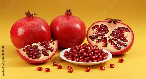 Ripe red pomegranates whole and halved with seeds fruit