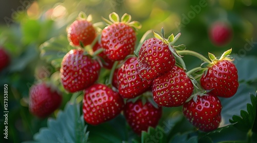 Ripe red strawberries hang heavy among green leaves under soft, diffused sunlight