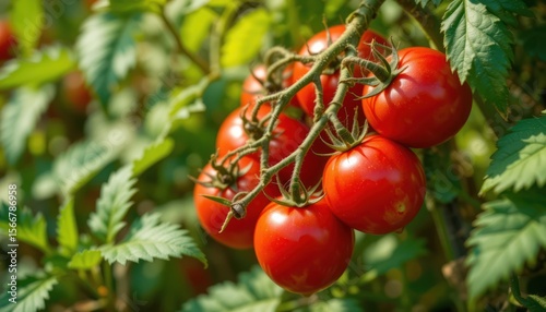 Ripe red tomatoes clustered on a vibrant green vine, basking in sunlight.