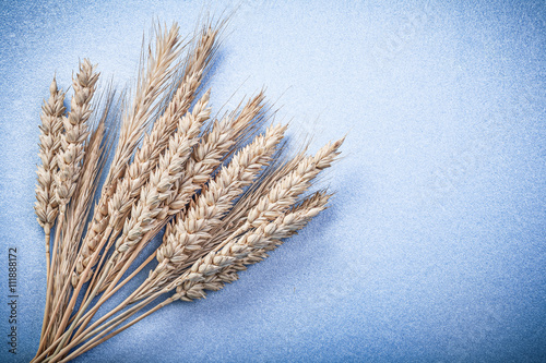 Ripe rye wheat ears on blue background directly above