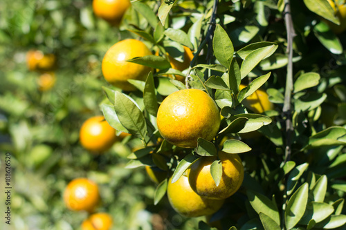 Ripe shogun orange hanging on tree. tangerine fruit