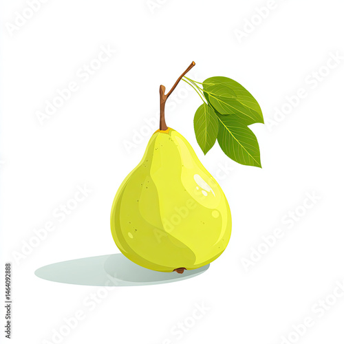 Ripe yellow pear with green leaves and brown stem casting soft shadow on white background, showing fresh and natural fruit in simple illustration style