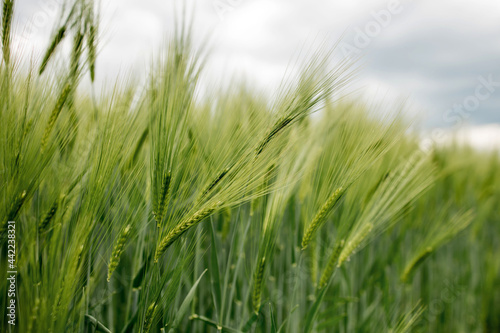 Ripening ears of meadow wheat field. Rich harvest Concept. Ears of green wheat close up.
