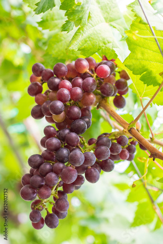 Ripening red grapes (Vitis Vinifera) are hanging on the vine with green leaves in the countryside vineyard for harvesting