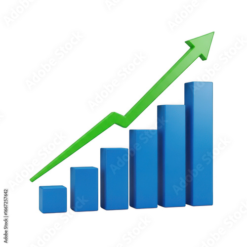 Rising bar chart with upward trend green arrow demonstrating financial growth transparent background
