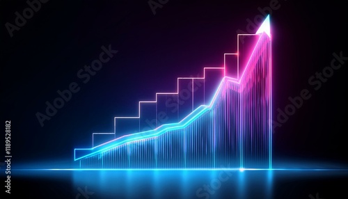 Rising graph in glowing neon colors, brightly shining lines on a dark background