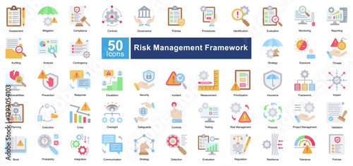 Risk Management Framework icon set in Flat Color style, featuring 50 icons of assessment, compliance, security, and governance. Ideal for corporate risk analysis, auditing, and policy enforcement.