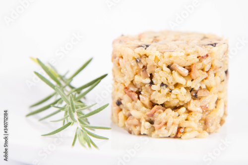 Risotto with button mushroom and bacon decorated with rosemary twig on a plate on a white background