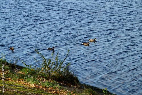 river, blue, water, shore, grass, ducks and drakes, walk, observation