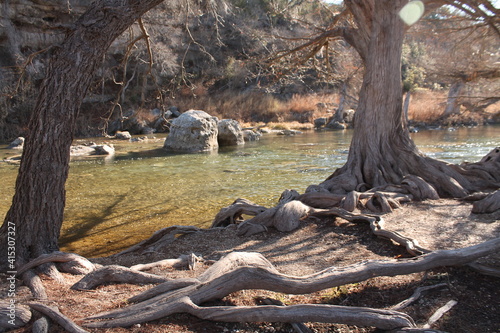 River flowing around large rock by cypress tree