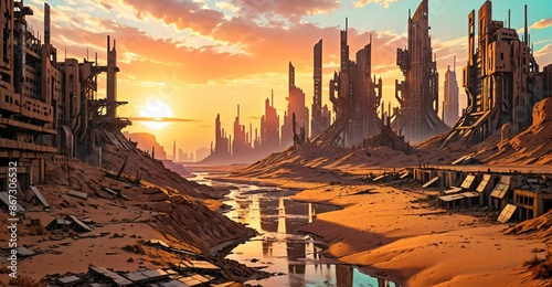 river through desert sci-fi cyberpunk city at sunset. futuristic dystopian town buildings and tall towers on the horizon. abandoned ghost town oasis.