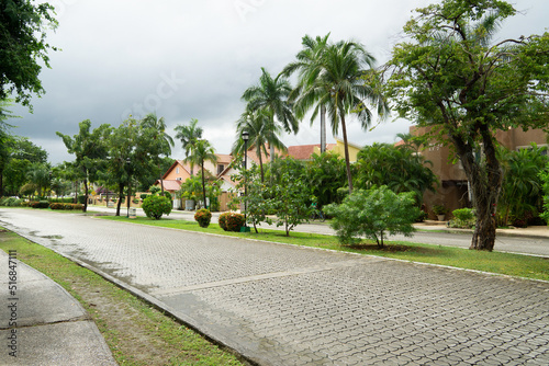 Road and walking path in a luxury residential complex. Behind the palm trees and manicured lawn, houses are visible. Expensive homes in tropical in cloudy weather.