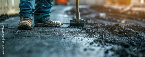 Road construction worker using tools on a new road. Free copy space for banner.