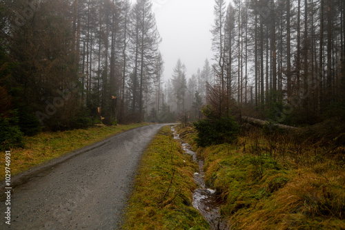 Road in a foggy forest in autumn