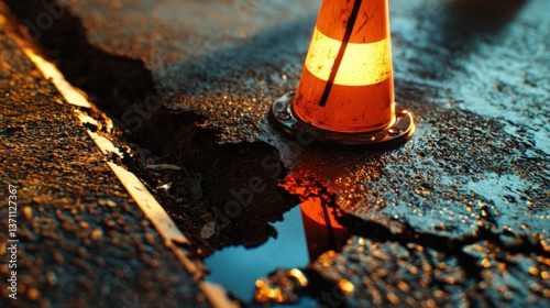 Road repair event traffic cone and cracked pavement urban setting photography late afternoon infrastructure challenges