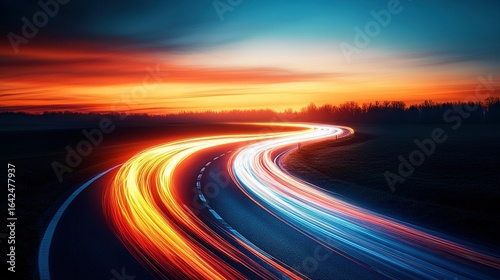 Road with light trails at dusk or dawn with trees in the background.
