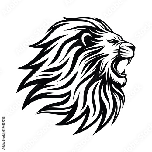 Roaring Lion Head Profile in Black and White with Detailed Mane and Open Mouth