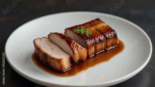 Roast Pork Belly served on a pristine white plate isolated on a white background