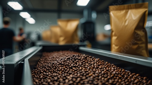 Roasted coffee beans on a conveyor system in a modern factory environment