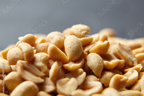 Roasted peeled peanuts closeup, salty beer snack on dark background