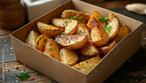 Roasted Potato Wedges in Box on Wooden Table