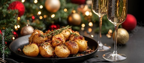 Roasted potatoes, garnished with herbs, served on a black plate with champagne flutes, amidst Christmas decorations