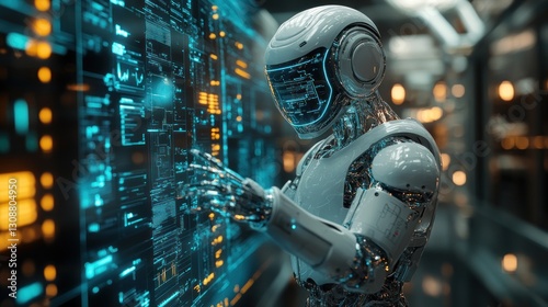 Robot analyzing data on futuristic digital interface in tech lab