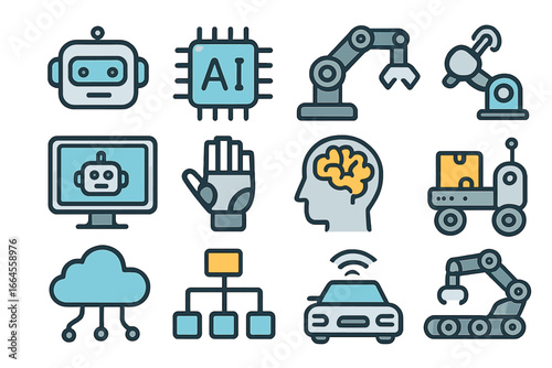Robot and artificial intelligence icon set. Automation technology, AI chip, and chatbot concepts. Robotic arm for industry, autonomous vehicle, and delivery bot illustrations.