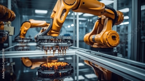Robot arms machine in intelligent factory industrial on monitoring system software.
