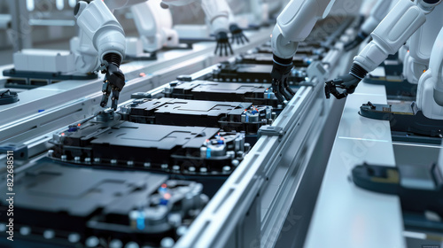 Robot arms works with electric car batteries at automated line in modern factory, technology of lithium energy for vehicle. Theme of ev, production, business