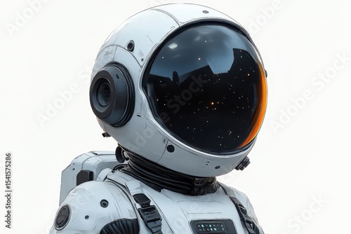 Robot astronaut standing against a white backdrop, showcasing modern design and advanced technology in space exploration