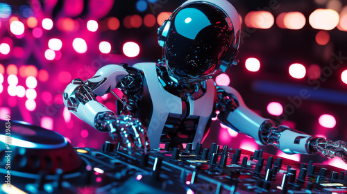 Robot DJ at a virtual reality turntable: a cyborg is mixing tracks on a soundboard at nightclub event. With an electronic music festival scene in the background, the robot manipulates various control
