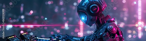 Robot DJ mixing music, neon lights and futuristic atmosphere