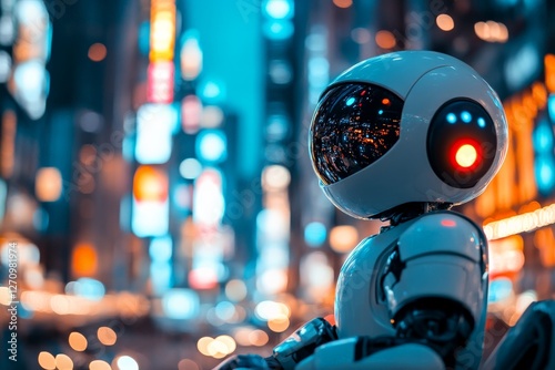 Robot exploring a vibrant urban landscape filled with colorful lights and modern architecture at night