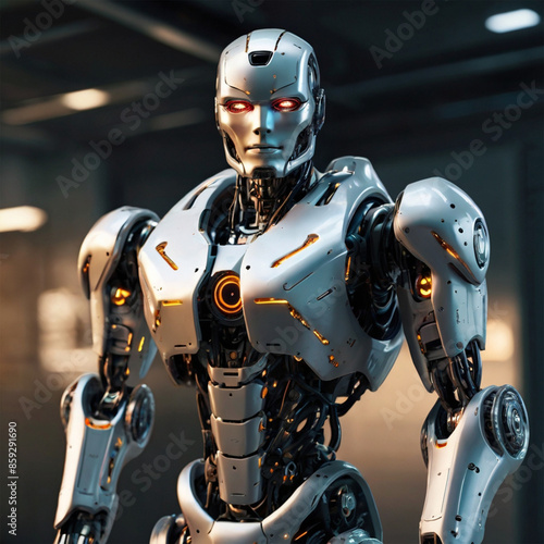 Robot, futuristic features, advanced AI, humanoid design, 4k resolution --ar 16:9, Generative AI, A futuristic image of a robot with advanced AI and humanoid design.
