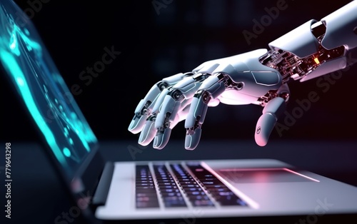 Robot hand typing on a laptop in dark setting