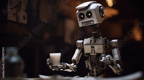 Robot holding a cup of milk while working at the desk