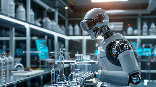 robot laboratory assistant chemical research experiments with glass flasks test tubes Sophisticated Pharmaceutical Innovation AI Interface in Lab Setting