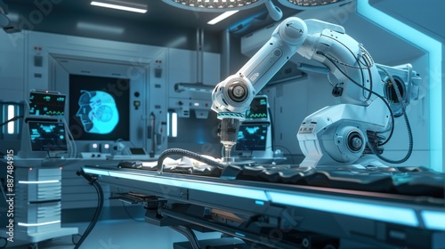 Robot performing precise surgical operation in a high-tech operating room with minimalist background