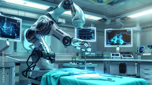 Robot Performing Surgery: A highly precise surgical robot in an operating room, arms delicately handling surgical instruments.