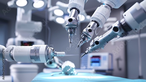 Robot Performing Surgery: A highly precise surgical robot in an operating room, arms delicately handling surgical instruments.