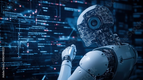 Robot with artificial intelligence is working on digital cyber data analysis desktop screen background wallpaper AI generated image